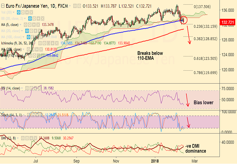 - EUR/JPY has shown a decisive break below 110-EMA at 133.06, scope for further weakness.