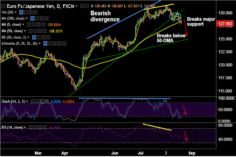 - 50-DMA support at 128.32 has been breached, the pair is currently trading at 127.94, just below the 128 handle.
