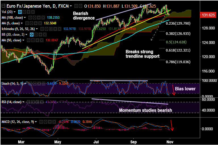 - Price action has slipped below daily cloud and has broken below 50-DMA at 132.02.