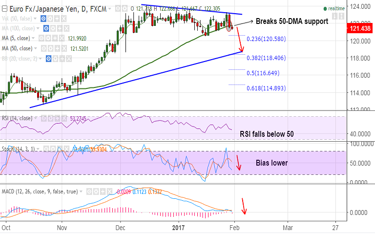 - EUR/JPY has shown a break below major 50-DMA support at 121.72 on Monday's trade.