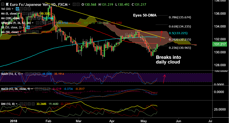 - The pair is currently testing resistance at 50-DMA at 131.33, breakout above to see further upside.