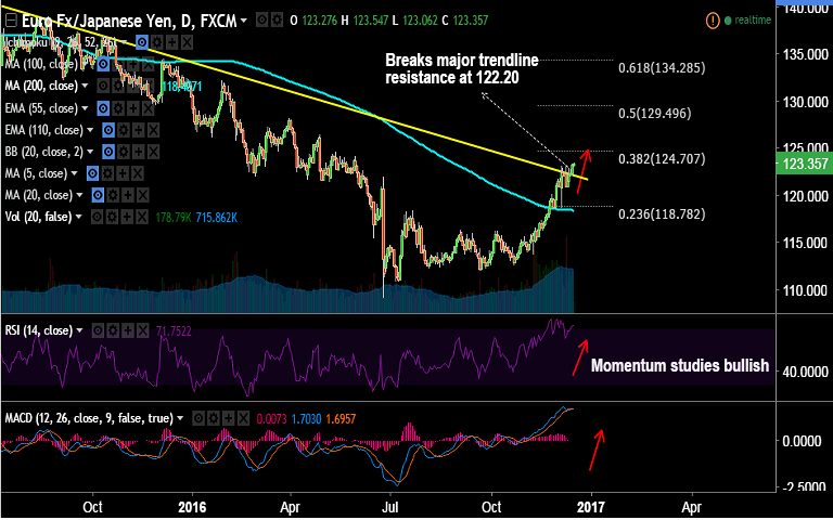 - EUR/JPY has shown a decisive breakout above major trendline resistance at 122.20.