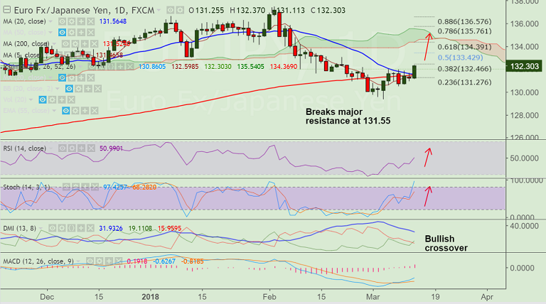 - EUR/JPY is trading 0.75% higher on the day, hit 3-week highs at 132.37 before paring some losses to currently trade at 132.25 levels.