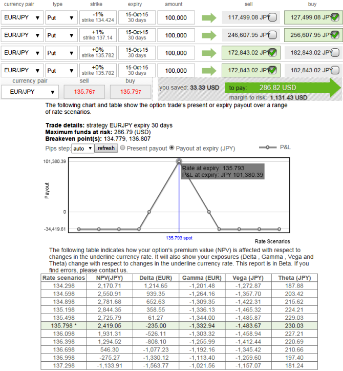 So, here goes the execution this way: Spot FX EURJPY is currently trading at 135.852. Buy 1M out of the money put and 1M in the money put simultaneously short 2 lots of at the money puts for a net debit.