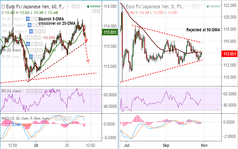 - Major support levels - 113.72 (1H 50-SMA), 113.55 (trendline), 113.26 (session low Oct 26)