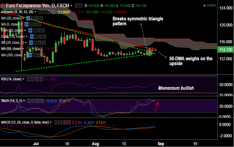 - Break above 50-DMA could see a test of 114.81 ((Aug 2nd high), 115.50 (June 16th low) and then 116 levels.