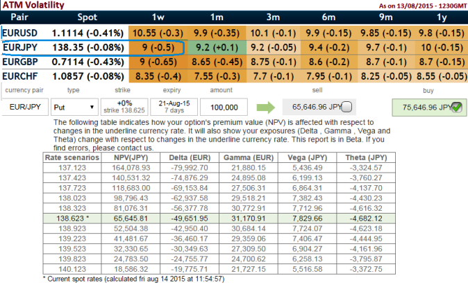 The naked at the money put option with 7 days expiry was highly sensitive to moves in the underlying exchange rate of EUR/JPY when gamma was at around 0.31 and 1W ATM volatility is perceived at 9% and it is likely to increase in long run (for next 6 months to 1 year span). Because in the sensitivity table gamma shows how much the delta will shift for a corresponding underlying rate moves by 1%. With reducing volatility gamma adds to the risk and reward profile for both holders and writers.