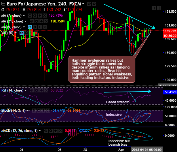 Chart and candlestick patterns formed- hammer patterns occurred at 130.246 and 130.182 levels while hanging man patterns have occurred at 130.797 and 130.831 levels on the 4H chart, and at 135.394 levels on monthly plotting. Shooting star at 129.366 levels on monthly terms.