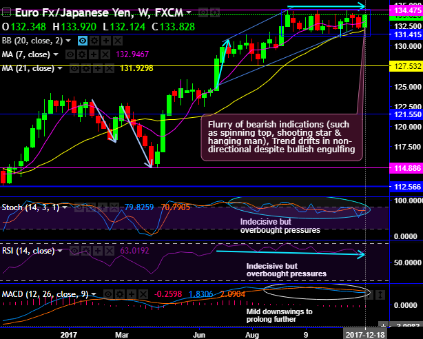 Chart and candlestick pattern formed- non-directional, hanging man, and shooting star appear at 133.521 and 132.143 levels on weekly plotting and shooting star at 132.336 levels on monthly plotting. As a result, bulls in the consolidation phase seem to be exhausted at 61.8% Fibonacci levels from the lows of 109.205 levels,