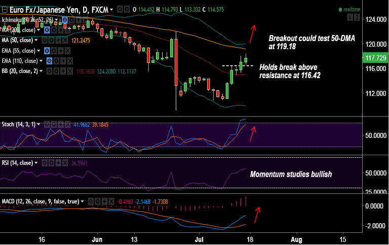 - EUR/JPY has bounced off 20-DMA support at 114.90 earlier this week and is holding the break above major trendline resistance at 116.42.