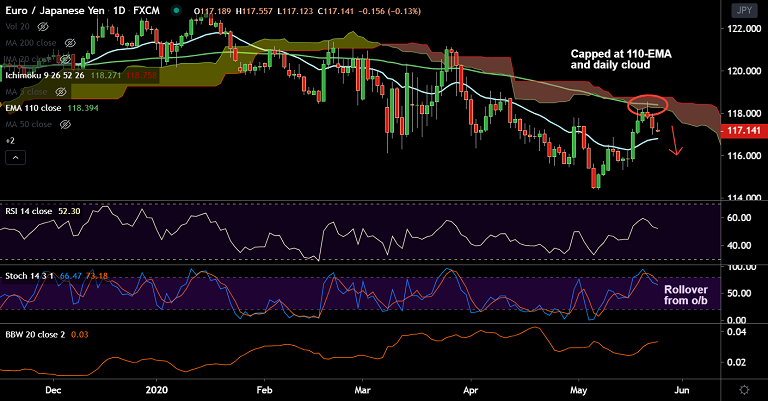 Recovery capped at daily cloud and 110-EMA. RSI is biased lower and Stochs are on verge of reversal from overbought levels.