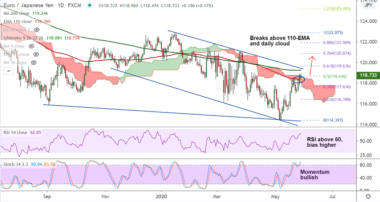 EUR/JPY extends gains above 110-EMA resistance and was trading 0.18% higher on the day at 118.75 at around 06:00 GMT.