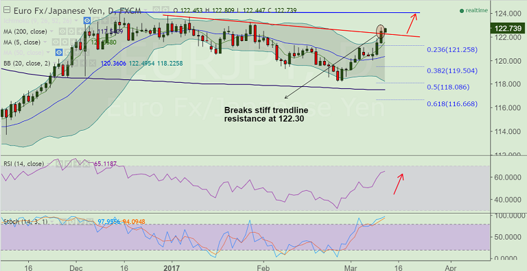 - EUR/JPY is extending upside after breakout above major trendline resistance at 122.30.