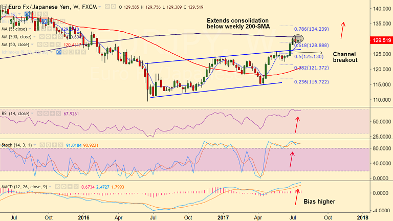 - EUR/JPY is extending consolidation phase below weekly 200-SMA at 130.60. We see further bullishness only on break above.