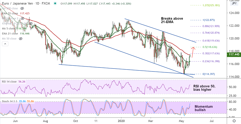 Support levels - 117.42 (55-EMA), 116.45 (21-EMA), 116.13 (20-DMA)