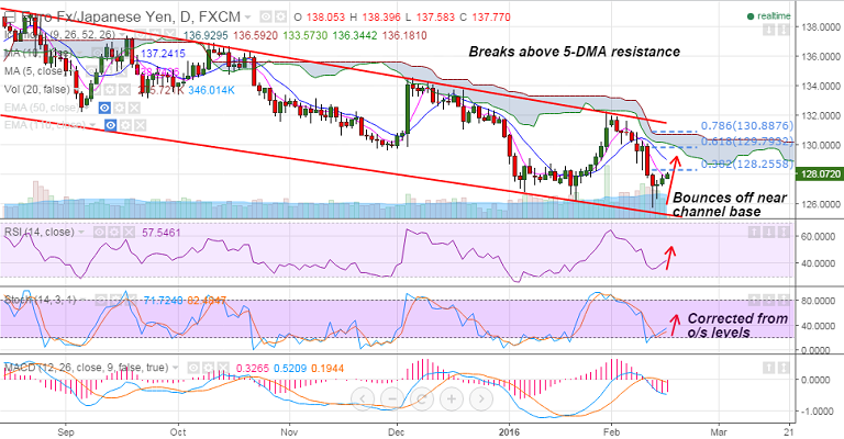 EUR/JPY extends retrace from near channel base, breaks above 5-DMA resistance at 127.68, currently at 128.07.