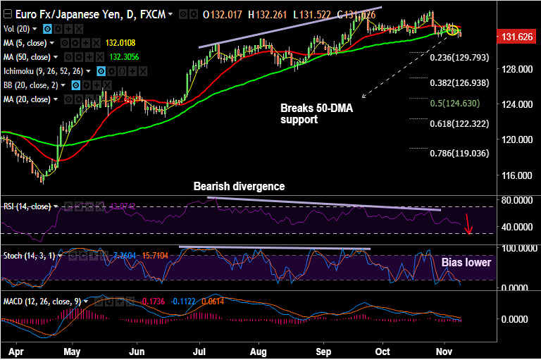- EUR/JPY extends grind lower after break below strong support at 50-DMA, bias remains bearish.