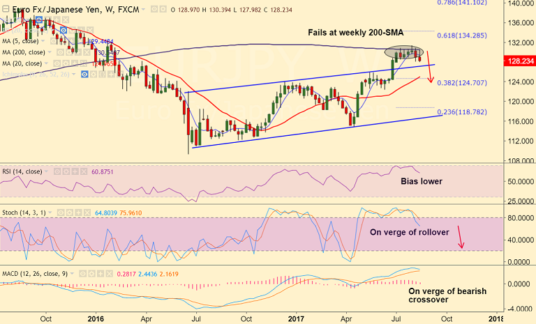 - EUR/JPY fails at weekly 200-SMA, resumes downside with hammer formation on weekly charts.