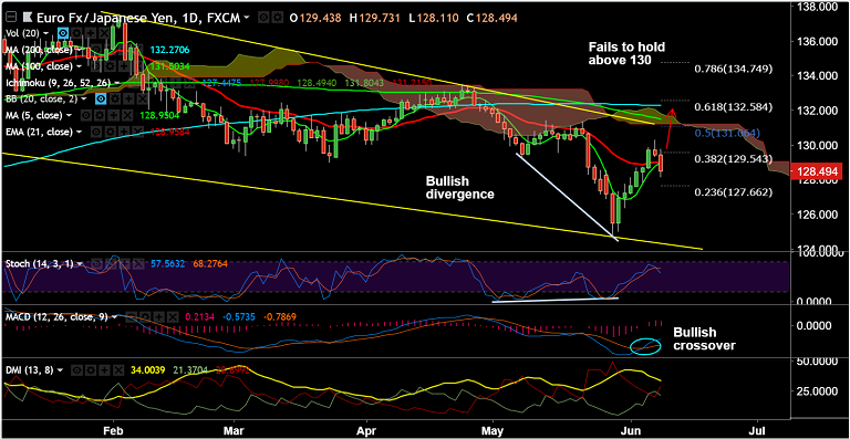 - EUR/JPY fails to hold gains above 130 handle, retraces below 21-EMA as Euro extends falls on trade, Italy, data.