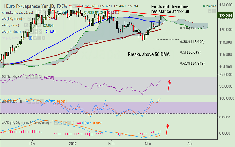 - Technical studies support upside. The pair has broken past 50-DMA at 121.14.