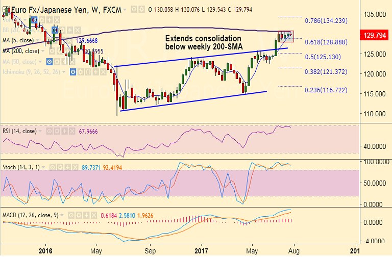 Resistance levels - 129.88 (1H 20-SMA), 130.59 (weekly 200-SMA), 130.76 (July 11 high), 131