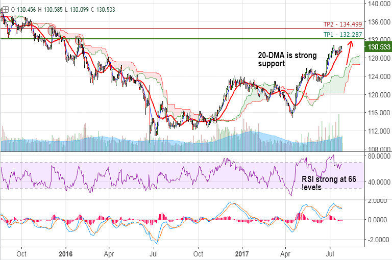 Resistance levels - 130.76 (July 11 high), 131, 132 (Feb 2016 high)