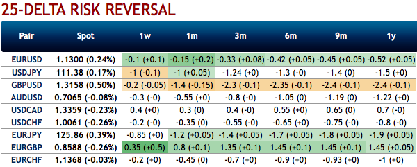 Risk reversals Substantiate Skews (EURJPY):Most importantly, to substantiate the above indications, bearish neutral risk reversal numbers of all euro crosses except EURGBP (especially EURJPY) across all tenors are also substantiating bearish risks in the long run amid minor abrupt upswings in the short-term as you could observe that there has been the minor positive shift in the risk reversal numbers. Please be noted that 3m IVs are overall OTC barometer is a noteworthy size in the forex options market that can stimulate the underlying forex spot rate.