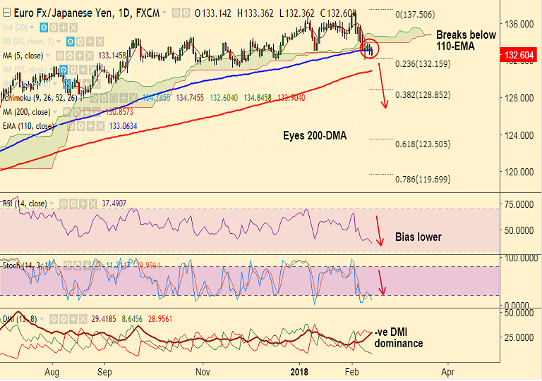 - EUR/JPY edges higher from session lows at 132.36, break below 110-EMA keeps scope for downside.