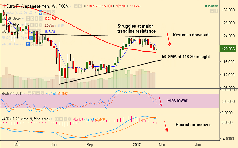 - Bears eye weekly 50-SMA at 118.80, break below could see test of rising trendline at 116.50.