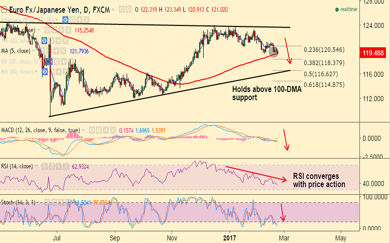 Support levels - 119.31 (100-DMA), 118.80 (Weekly 50-SMA), 117.68 (200-DMA), 116.50 (trendline)