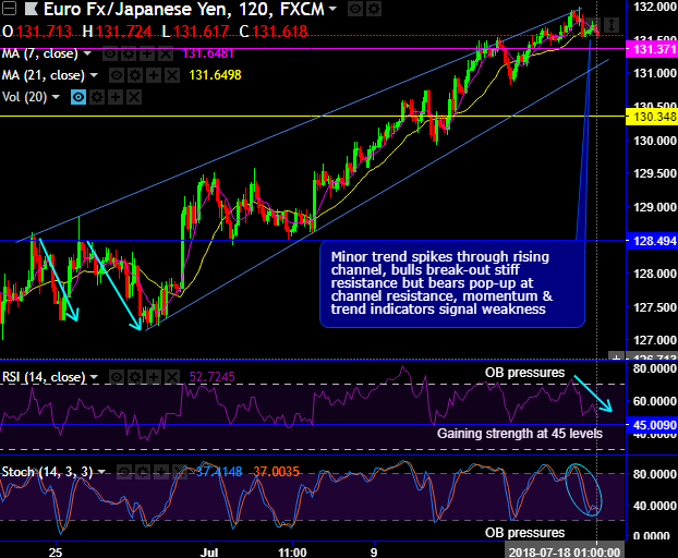 Trade tips: On a medium-term trading perspective, at spot reference: 131.570 levels, it is advisable to buy 1m one-touch call option, use strikes at 131.987 levels, the strategy is likely to fetch leveraged yields as long as underlying spot FX keeps spiking further until expiry duration.