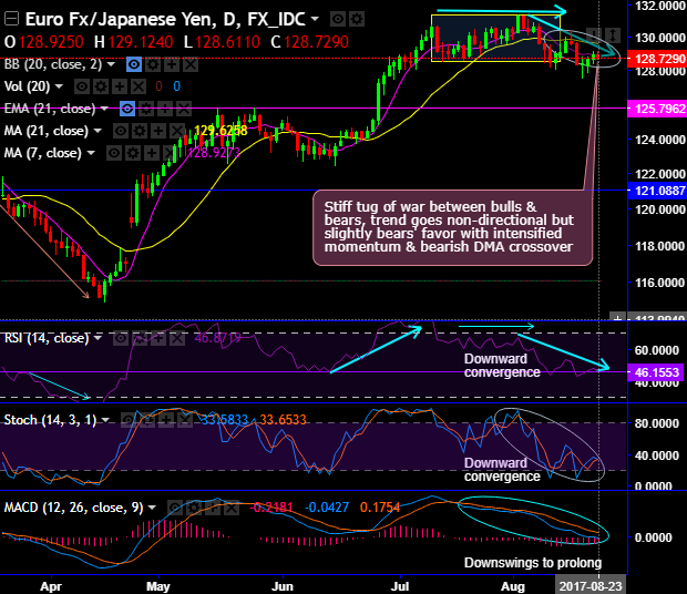 You could very well observe ever since EURJPY swings form shooting star pattern at 129.6060 levels, the bears manage to slide below DMAs constantly despite the stiff tug of war between bulls & bears. As a result, the trend, for now, goes slightly in bears' favor with intensified momentum