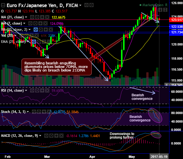 Contemplating above technical reasoning, for intraday trading perspective, it is advisable to buy boundary binaries on dips upper strikes at 124.1384 (7DMA) and lower strikes at 123.385. The speculators are likely to add magnifying effects to their yields as long as spot FX remains within these strikes on expiration.