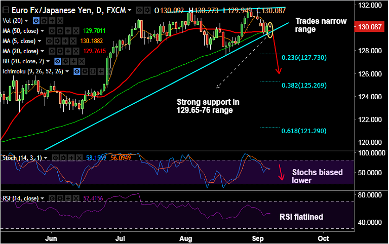 Resistance levels - 130.18 (5-DMA), 130.40 (Aug 18 high), 130.77 (July 11 high), 131, 131.70 (Aug 30 high)