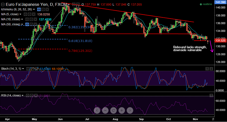 - EUR/JPY has rebounded to retake the 131 handle and is currently trading at 131.35, however rebound lacks strength.