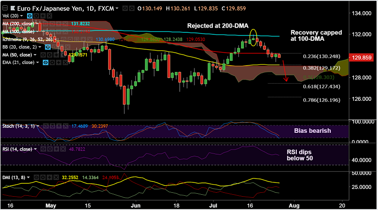 - EUR/JPY is trading 0.21% lower on the day at 129.86 at the time of trading, bias remains bearish.
