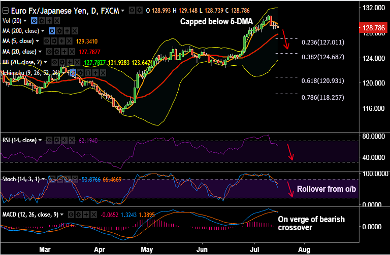 - 5-DMA has turned and is capping minor recovery attempts in the pair. We see scope for drag upto 127.79 20-DMA.