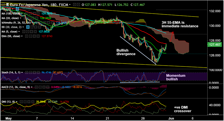 Recommendation: Good to go long on break above 127.57 (3H 55-EMA), SL: 127, TP: 128/ 128.35/ 129