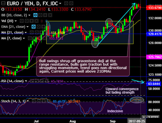 Alternatively, at spot ref: 133.6700 we advocate arresting extended bullish risks by initiating longs in futures contracts of near-month expiries by keeping strict stop loss at around 131.6500 levels.