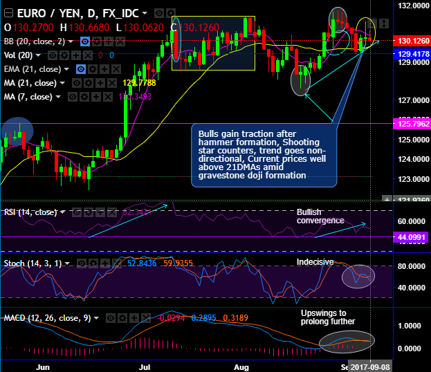 For now, gravestone doji candle has occurred yesterday at 130.2580 levels that may get you bear-trapped as this cannot afford to be isolated, both leading and lagging oscillators are little indecisive but slightly in bulls’ favor.