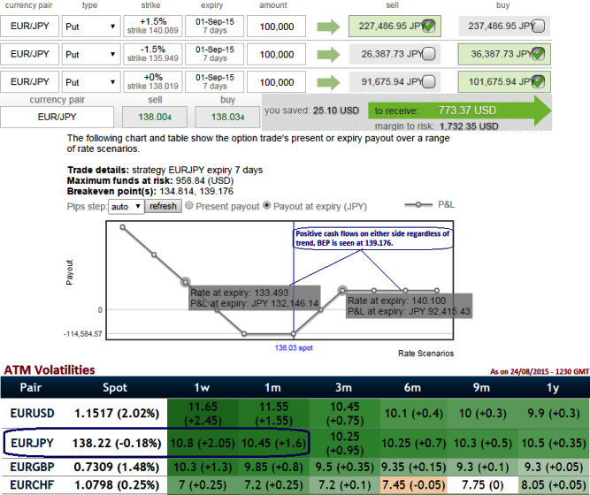 Maximum returns are limited to the extent of initial credit received if the EURJPY rallies above the upper breakeven point (BEP) but large unlimited profit can be achieved should the underlying exchange rate of EURJPY makes a vivid downswings below the lower BEP.