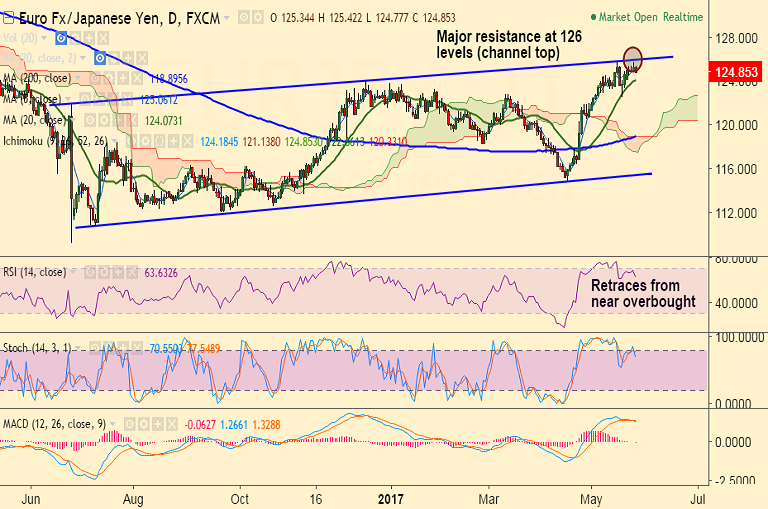 Resistance levels - 125.03 (5-DMA), 126 (channel top), 126.47 (April 27 high), 127, 128.22 (Mar 31, 2016 high).
