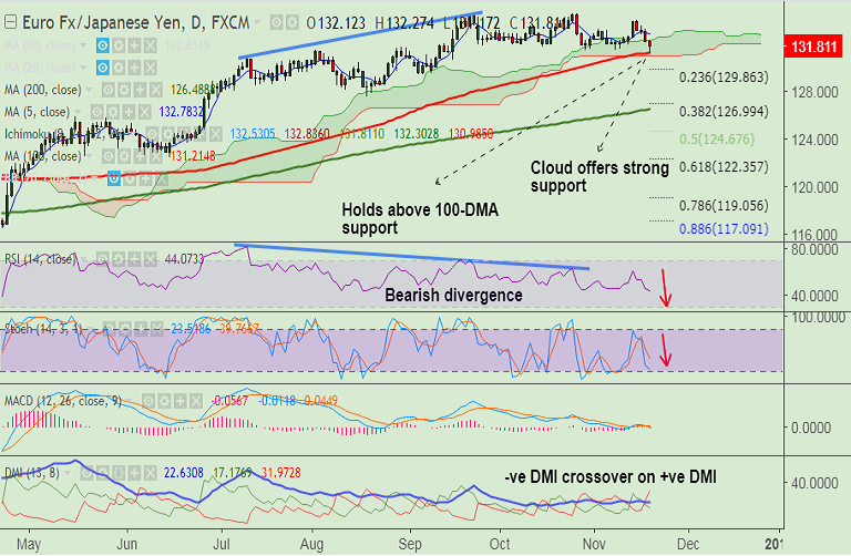 Support levels - 131.21 (100-DMA), 131, 130.60 (Sept 15 low), 129.86 (23.6% Fib retrace of 114.85 to 134.50 rally)