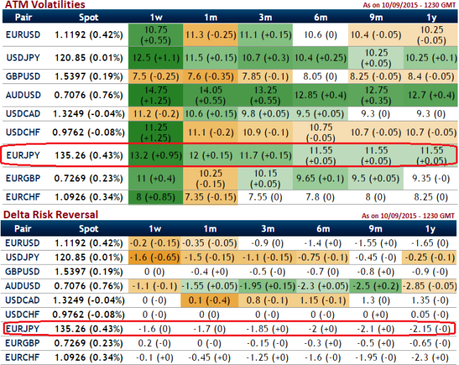 One can observe delta risk reversal for this pair is gradually turning into high negative values, this would mean that market sentiments for this pair have been negative for this pair, on the contrary even if it falls, it would not slip beyond 125.50 in near future and on upside it would not rise also beyond 140.50. Moreover, the pair is likely to perceive implied volatility close to 12-13% of ATM contracts, thus we recommend deploying short put ladder spreads which is suitable for prevailing significantly higher volatility times.