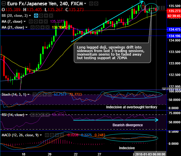 Ever since the long-legged doji occurs at 135.493 and 135.376 levels, the trend has been drifting in sideways (refer 4H chart). Consequently, these bearish patterns signal weakness as the leading oscillators indicate overbought pressures.