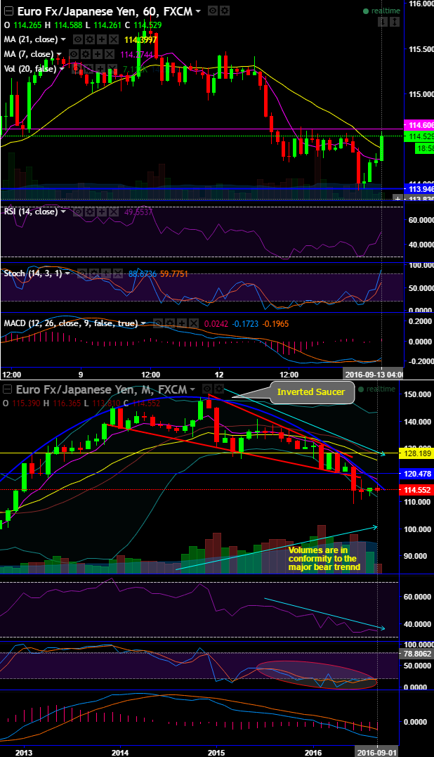 Although EUR seems to have taken a halt from its momentary bull run against JPY (see 1H plotting), we see healthy momentum in upswings upto 114.606 levels.