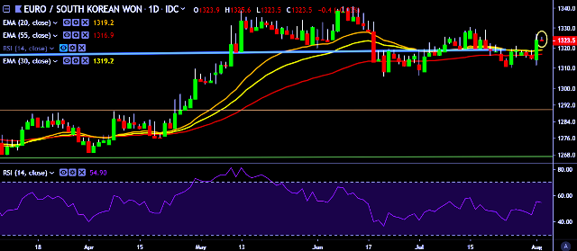 We prefer to take long position on EUR/KRW around 1,320, stop loss 1,310 and target of 1,340.