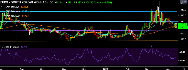We prefer to take long position on EUR/KRW around 1,328, stop loss at 1,322 and target of 1,337/1,358.