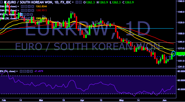 We prefer to take long position on EUR/KRW around 1,262, stop loss at 1,252 and target of 1,280.