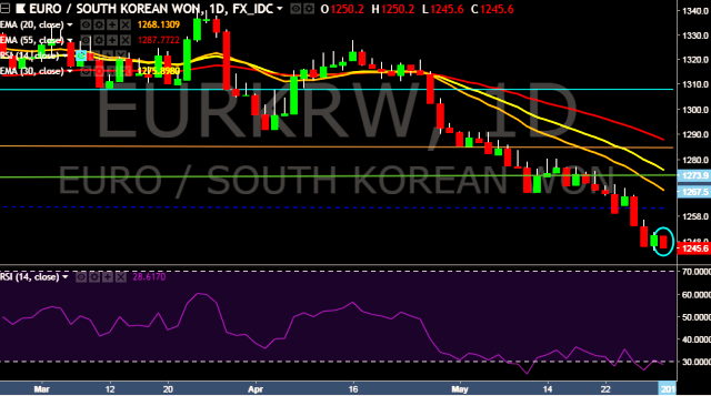 We prefer to take short position on EUR/KRW only below 1,244, stop loss at 1,254 and target of 1,222/1,205.